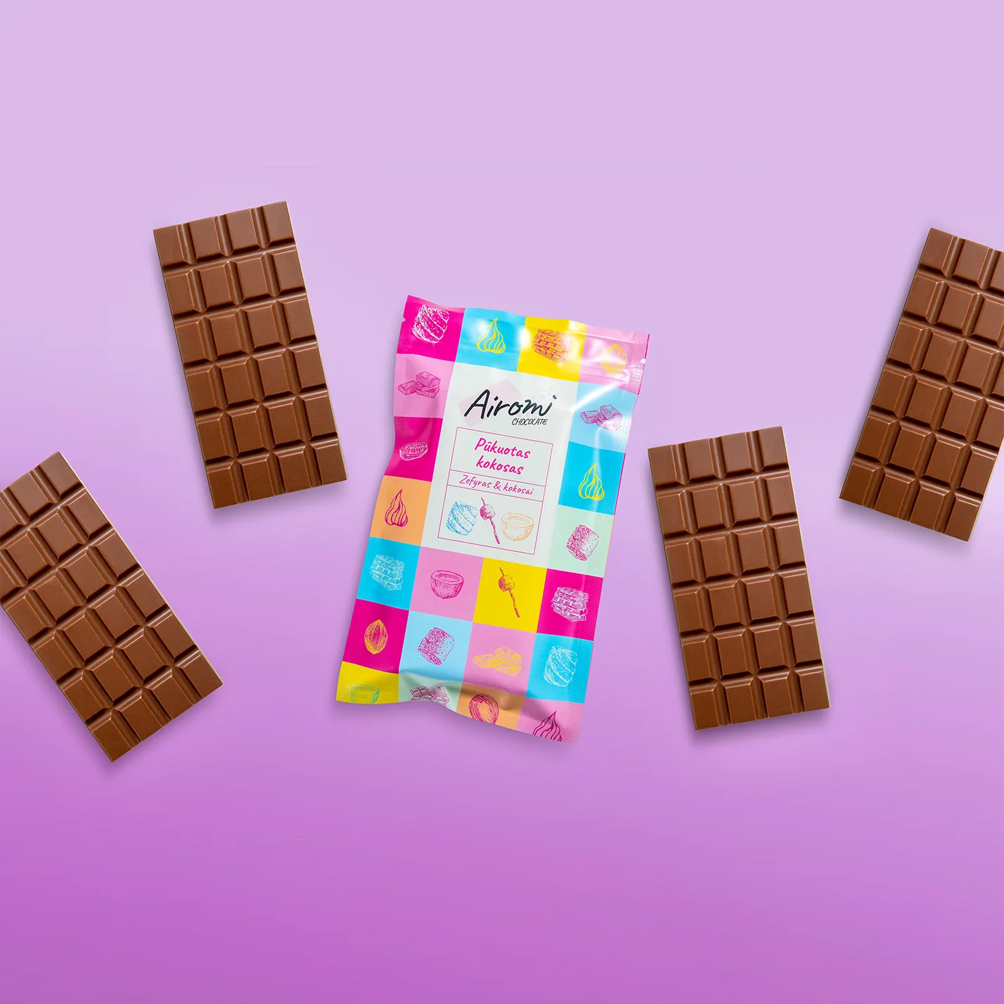 kakavos masė, cukrus, pieno milteliai, kakavos sviestas, kokosų drožlės, gliukozės sirupas, želatinas, vanduo.